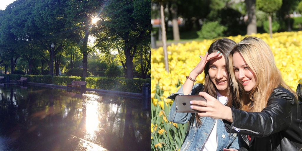 Наконец мы в парке! На территории очень живописно: много зелени и цветов. Отдыхающие катаются на велосипедах, досках и самокатах, лежат на мягких пуфах, покупают мороженое в симпатичных ларьках и сидят на красивых верандах. Все здесь сделано для людей, поэтому гулять - одно удовольствие!